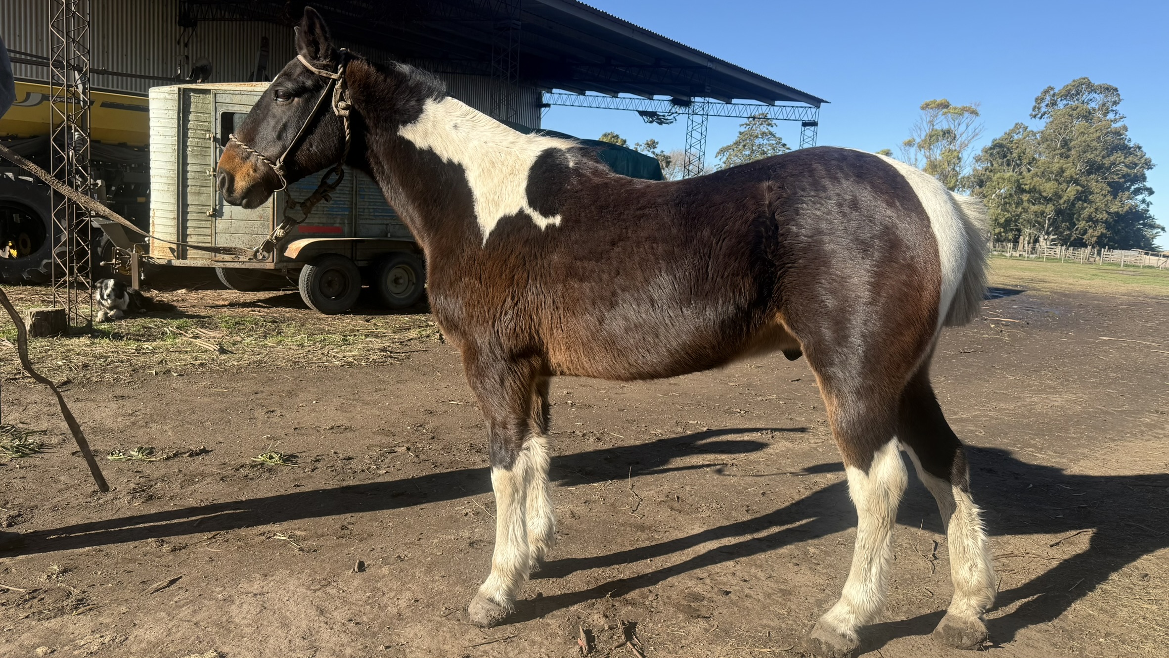 Este caballo tobiano tiene entre 8 y 9 años de edad y una alzada de 160 cm a la cruz tomados con cinta métrica.