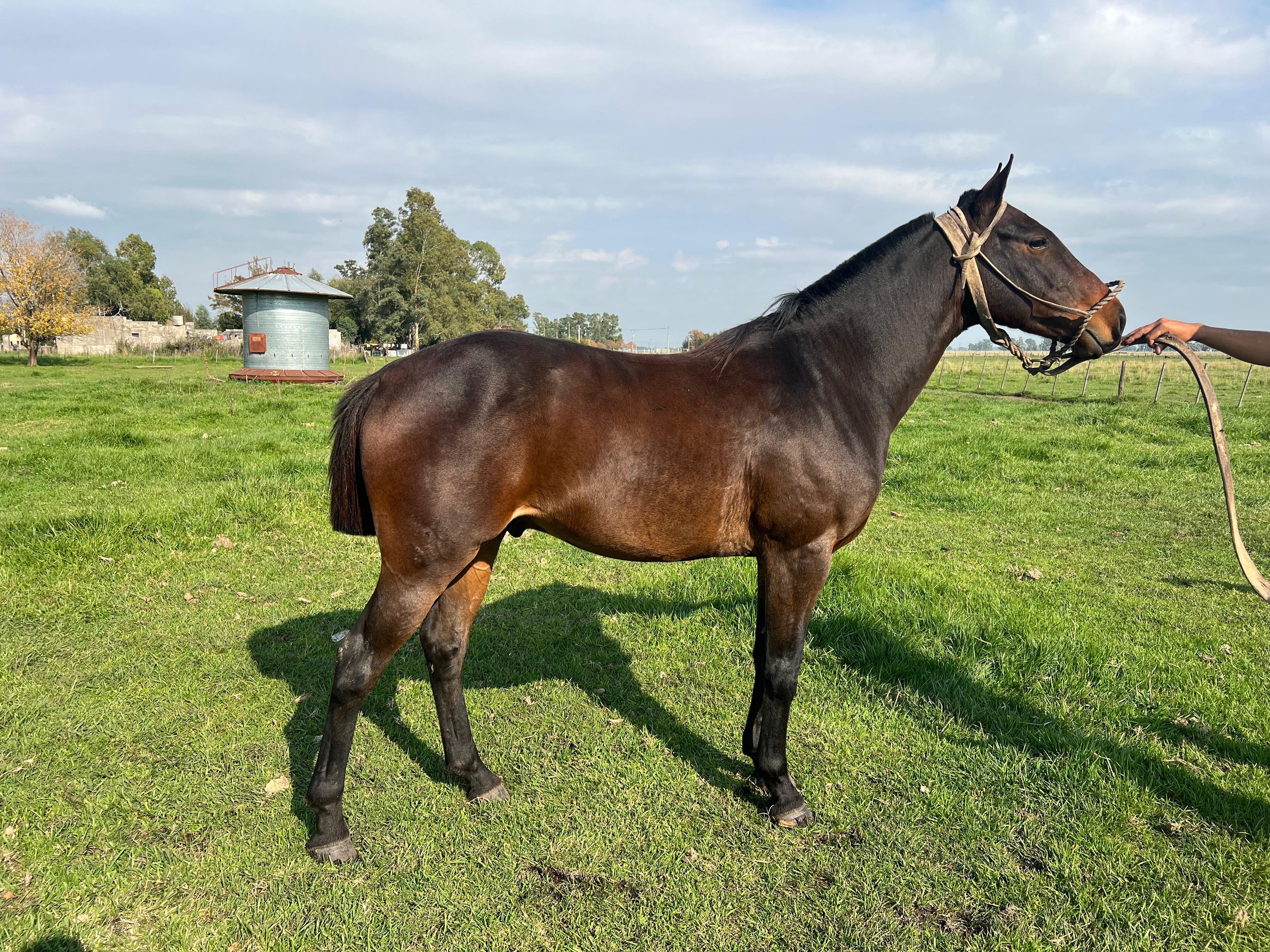 Este caballo zaino es un mestizo de polero que tiene 156 cm de alzada a la cruz y que tiene 5 años de edad.