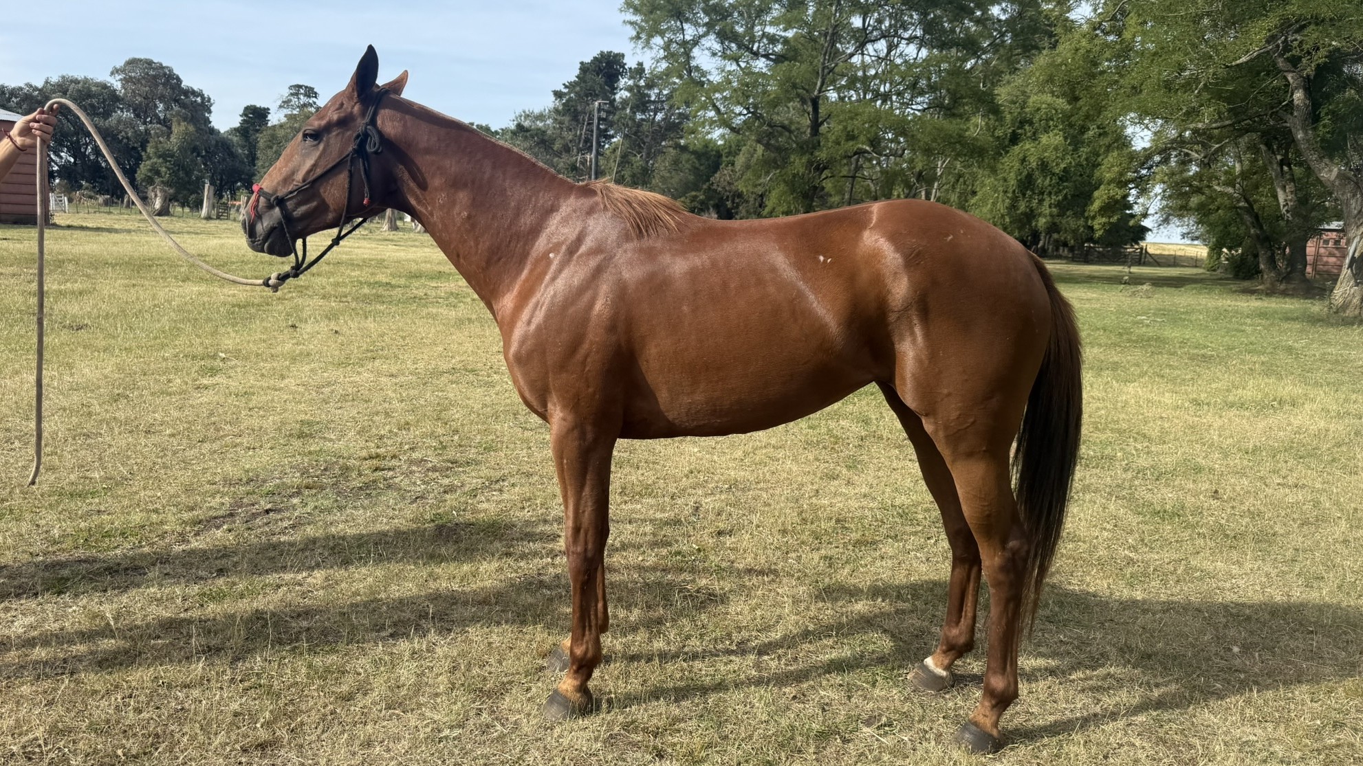 Esta yegua tostada tiene 4 años de edad y una alzada ubicada entre 154 y 156 cm tomada a la cruz. Tiene sangre polera.